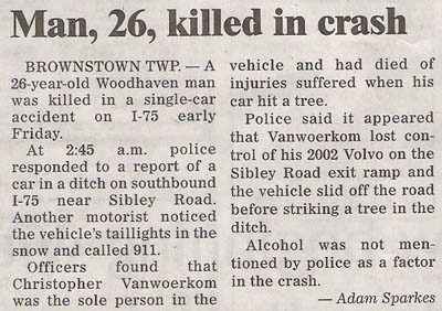 As some of you know Chris graduated from Woodhaven and I had the opportunity to march with him as a fellow 'bone.  When I was a freshman his uniquely cynical views of things definitely made life easier - or at least seem like it was easier.  He was kind enough to drive me to school and gave me stars to award my section with when I became section leader.  He was truly a great person.